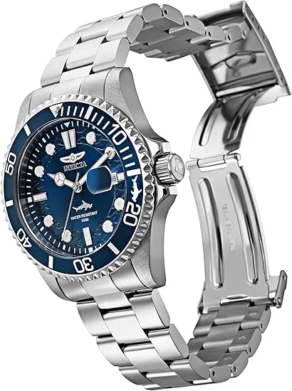 - Design: Stainless steel case 43mm diameter x 12mm thick; Blue dial; Magnified date window; Luminous hands and hour markers.