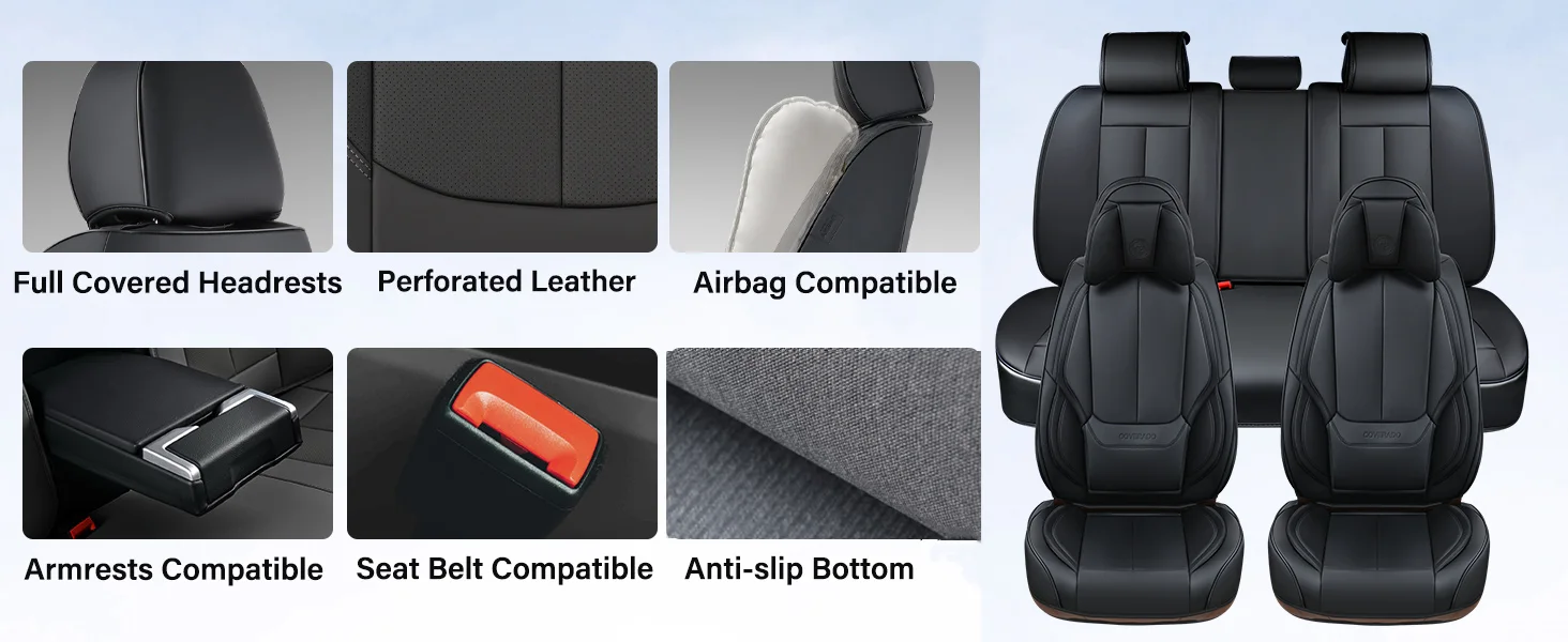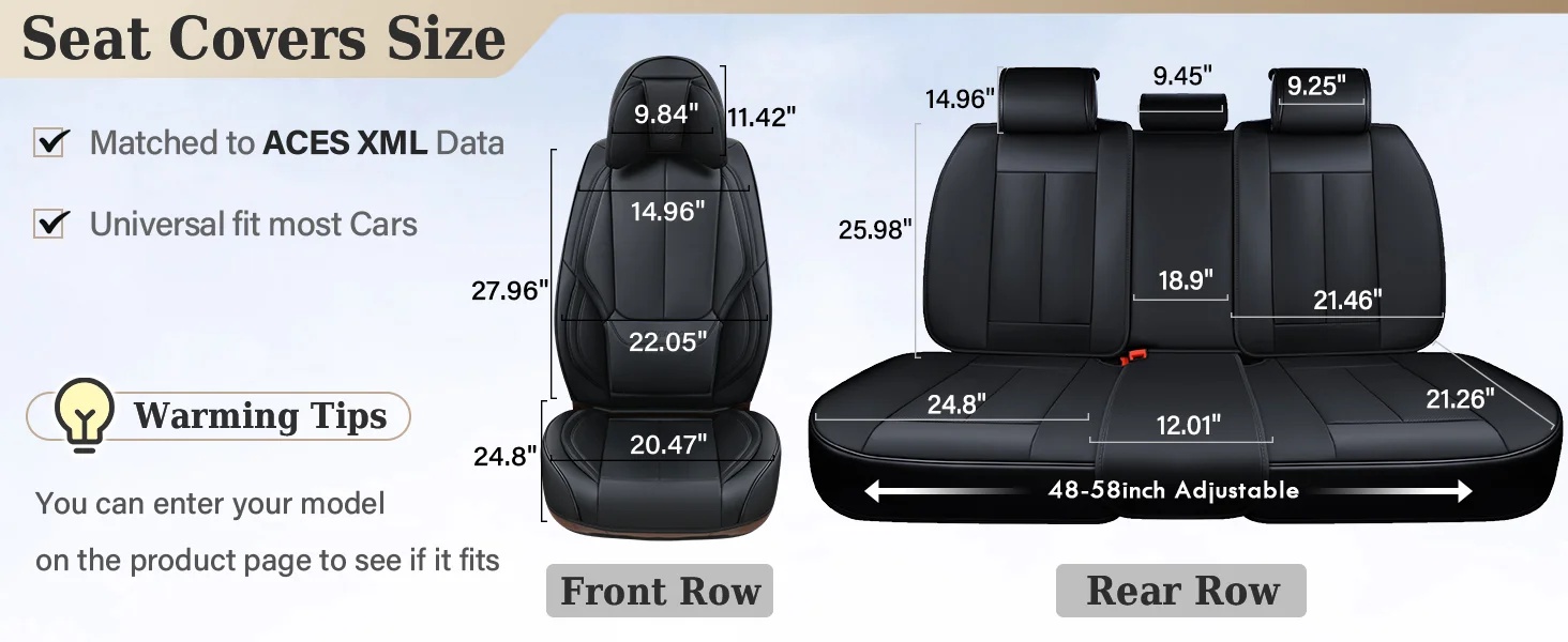 - 【Universal Fit】: Each pack comes with 2 front seat covers with head pillow and 3 rear seat covers, which are compatible with most Cars, SUV, Truck and Pick-up. You can easily install a custom new look on your seats without any hassles. Enter your model on the product page to check if it fits. Tips: Please measure the size of your seat before buying to avoid incompatibility